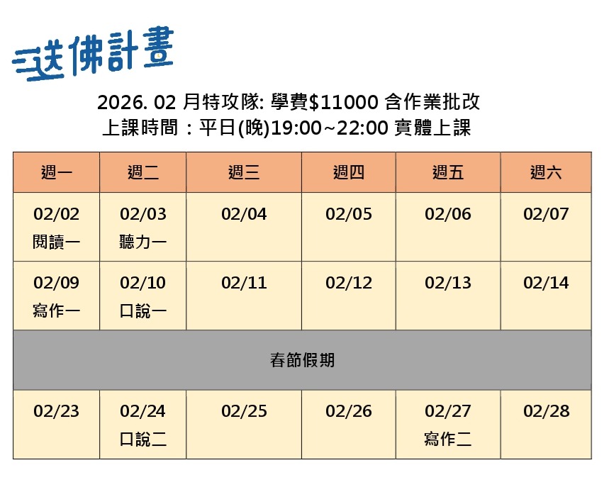 反過來,JJ班著重在口說+寫作的題目預測,以及狂刷題,提供同學們考前集訓的機會,隨堂練習,藉以培養臨場感,磨練技巧純熟度。